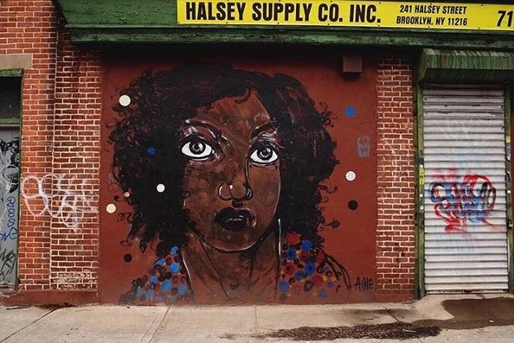 First stop on March’s Bed-Stuy Arts Stroll: a series of portraits on Tompkins and Halsey by Haitian-American artist Alan Aine. Recognizable across Brooklyn for thickly painted brush strokes and detailed, anime-like eyes, Aine’s murals carry a bold yet ethereal quality. This particular series has also provoked others to add their own tags: a wheatpasted poster from the “Stop Telling Women to Smile” series by artist Tatyana Fazlalizadeh, a small gallery of photo portraits by Back to the Street Photo, and the stenciled message “Warning Colonizers At Work.”
