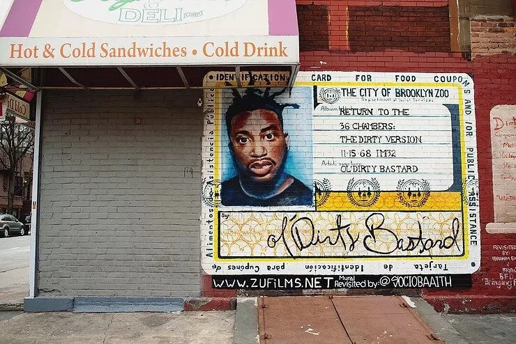 Other artwork along the tour represents the older style. A mural painted along the schoolyard of P.S. 305, for example, features Nelson Mandela, Venus and Serena Williams, Spike Lee, Maya Angelou, Florence Griffith Joyner, Louis Armstrong and Rosa Parks, among other intergenerational Black heroes. We also hit up Putnam and Franklin mural of an Ol’ Dirty Bastard album cover, infamously depicting the Brooklyn-born rapper’s public assistance card.