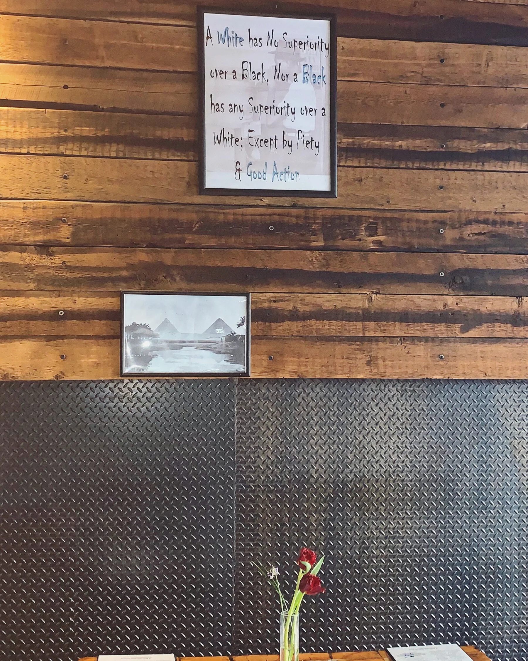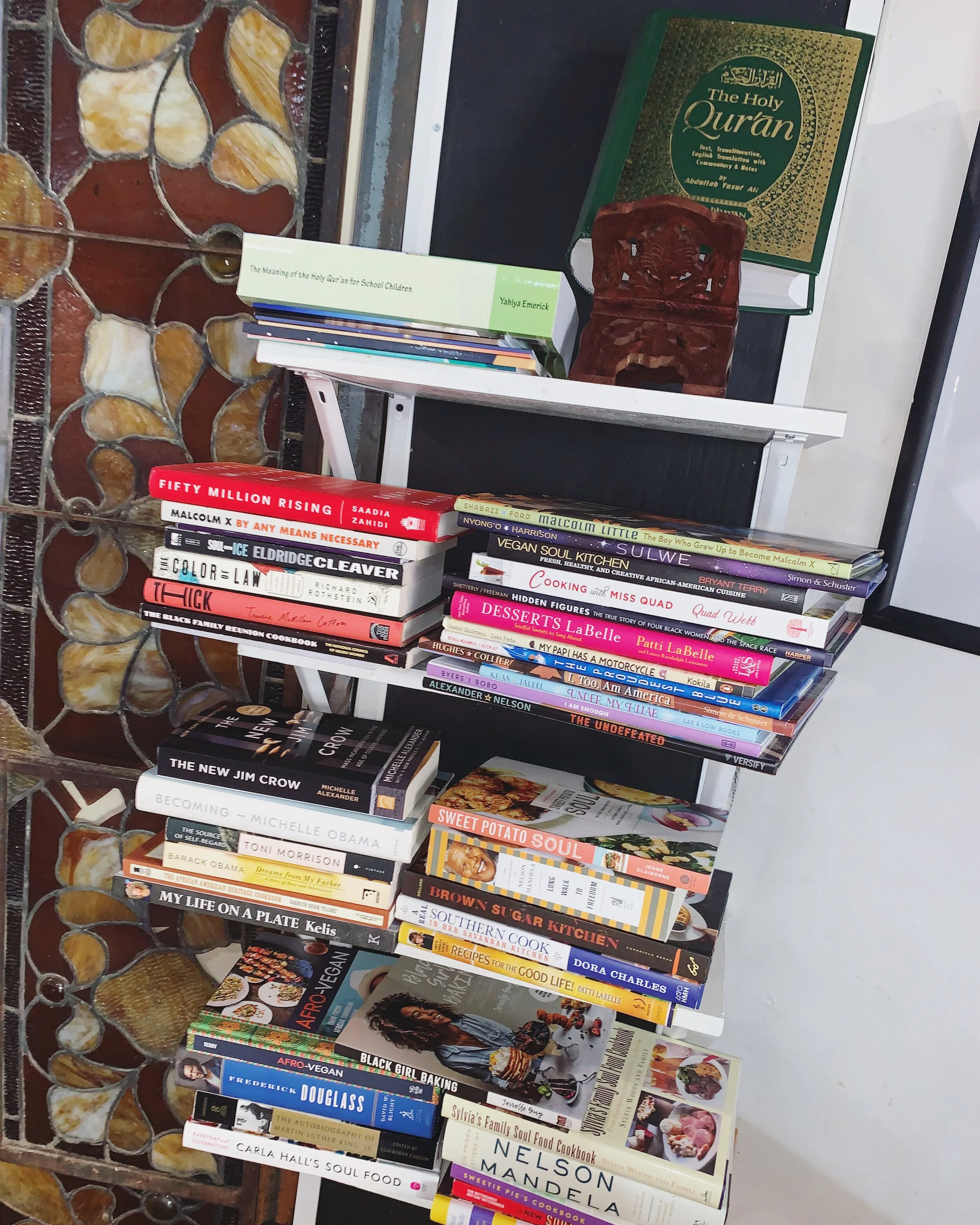 Its walls lined with brick, wood and black metal, Black Nile has a sleek industrial look, warmed up by touches like flowers, framed quotes and proverbs, and a bookcase carrying authors including Eldridge Cleaver, Michelle Alexander, Nelson Mandela, Toni Morrison and Tressie McMillan Cottom, as well as cookbooks from the likes of Kelis and vegan chef Bryant Terry.
