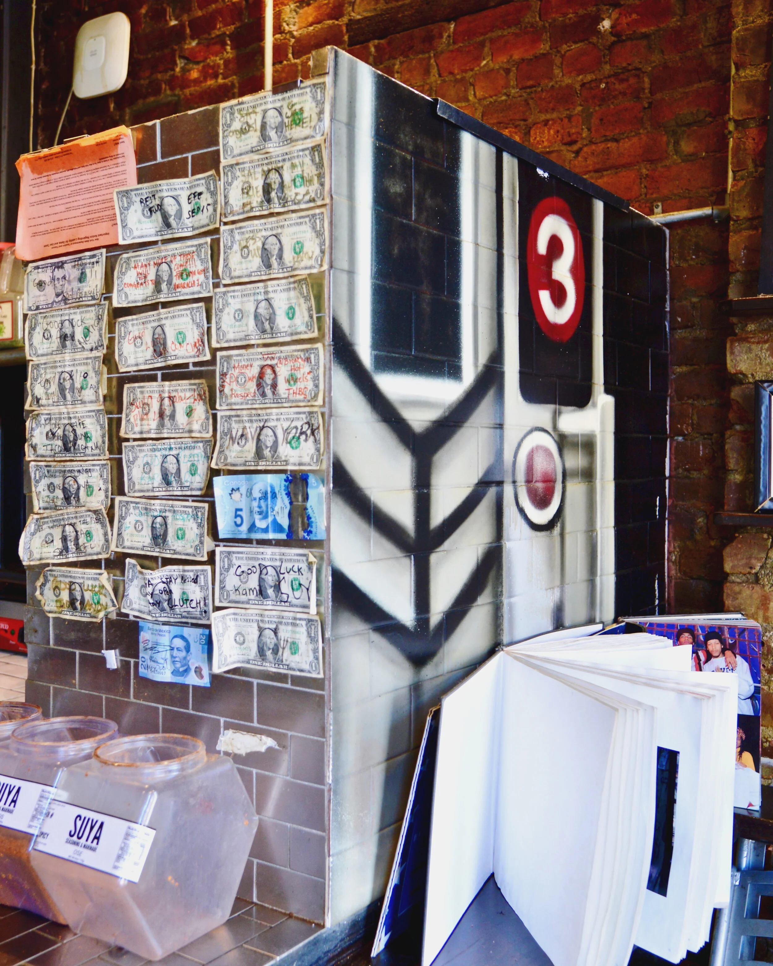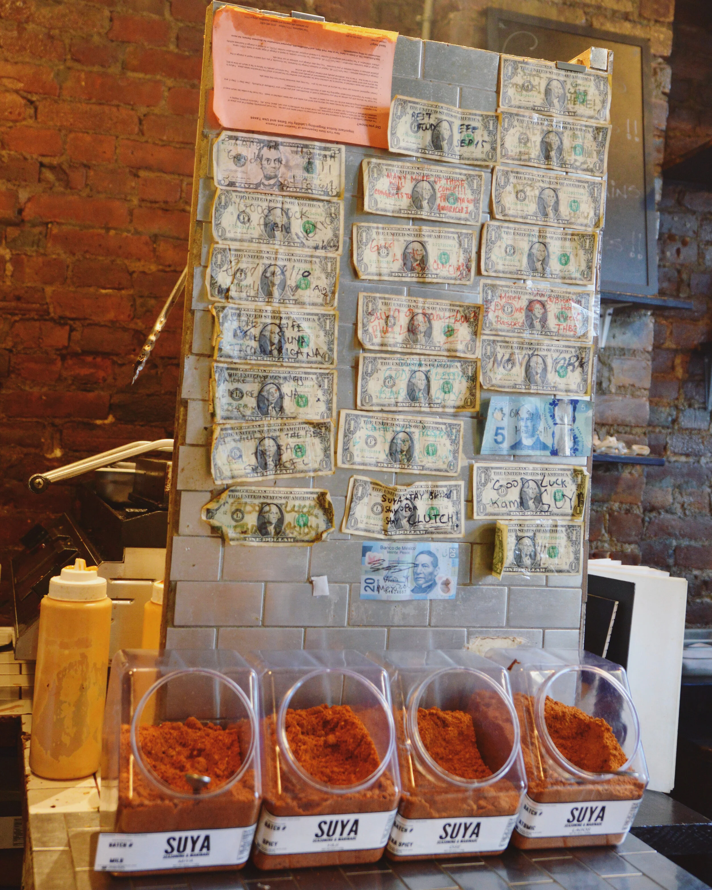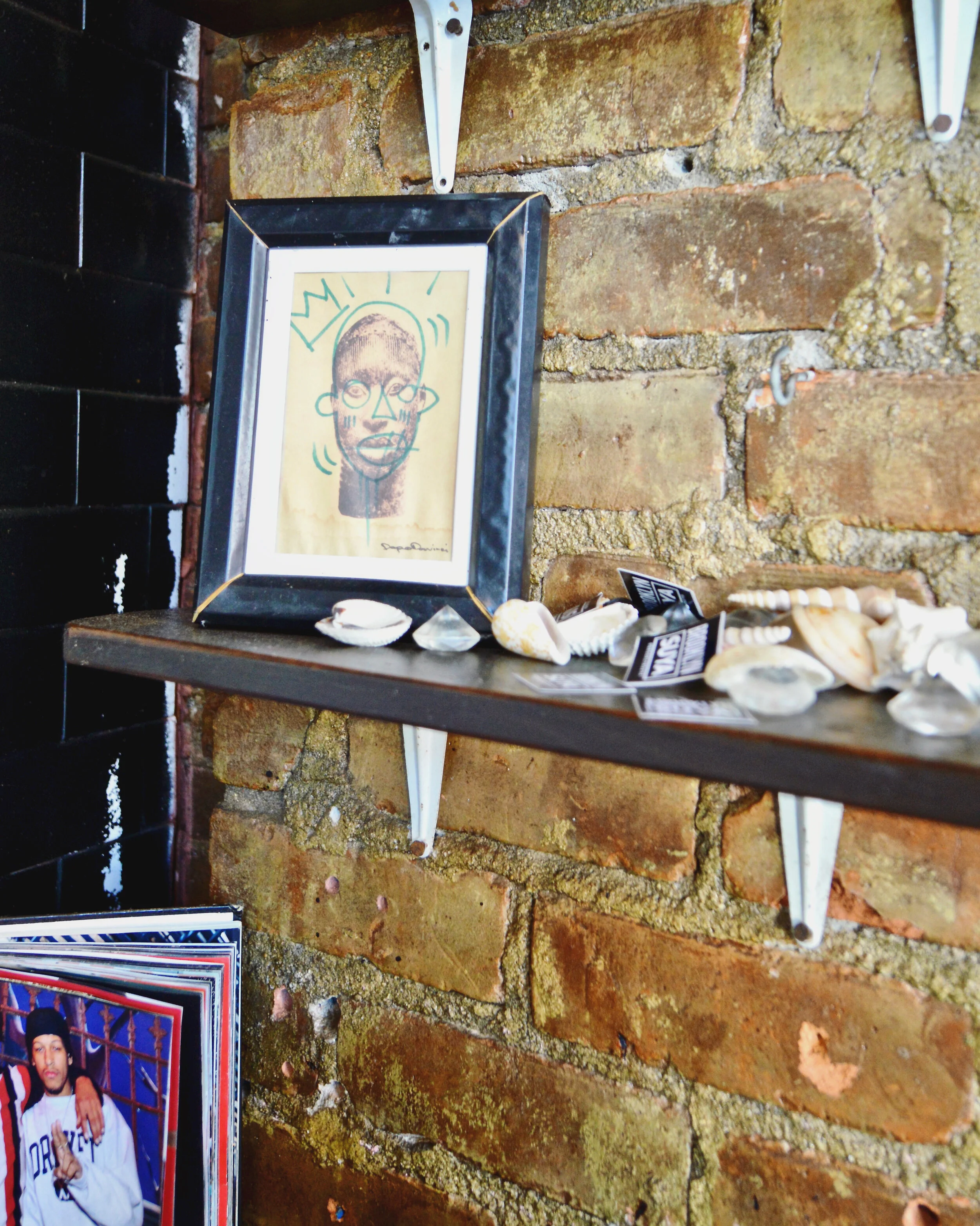 “We’re bringing you the concrete jungle, from Naija all the way to New York City,” Folusho says when describing the look and feel of Brooklyn Suya. The tiny space, which for now offers only takeout and delivery, is packed with design touches inspired by both locales. African paintings, sculptures and shells intermingle with exposed red brick and airbrushed art of the 3 train.