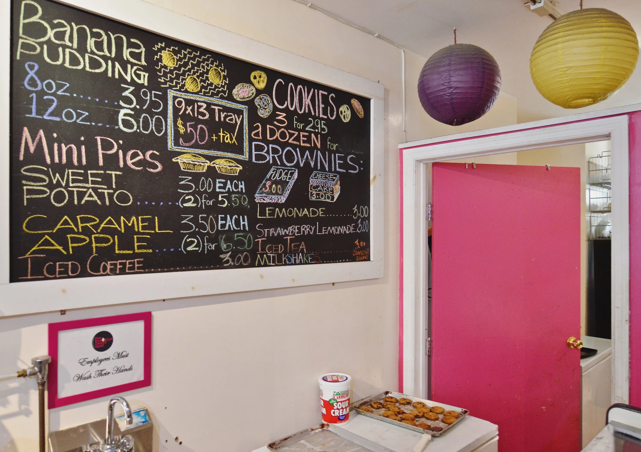 At Brooklyn Sweet Spot, Kym not only reps for her grandmother, she reps for her hood. Inside the small yet sunny shop is a framed portrait of the family matriarch and a mural of Brooklyn legends including the Notorious B.I.G., Spike Lee, Jay-Z and Kym herself (“on a good hair day”). From outside the bakery, just two blocks from Fort Greene Park, she lures folks over with chalkboards etched with eye-catching messages, such as “Home of That Bomb @$$ Carrot Cake” and “Banana Puddin’ of Yo Whole Life!”