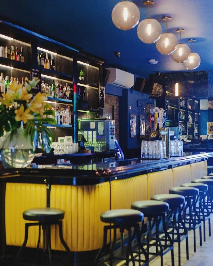 Kareem describes Bunton’s World Famous’ eclectic yet stately design as just a mix of things he likes. Yellow banquette seating and a padded bar contrasted against deep blue walls. Photos of Tupac, skateboarders, Debbie Harry, DMX and the Beastie Boys. A nice-ass bathroom encased in glossy black tile.