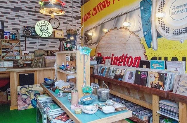 “I’ve always been a flea market, junk shop type of cat,” says Martin Brewer, owner of Halsey & Lewis, a vintage shop selling records, books, home goods, and “various and sundry” gifts. Brewer speaks too modestly of his skillfully curated inventory: intriguing finds including antique lamps, 19th century-looking prairie boots, and retro glassware, with specialty products like body butters and oils, healing crystals and bundles of Palo Santo.