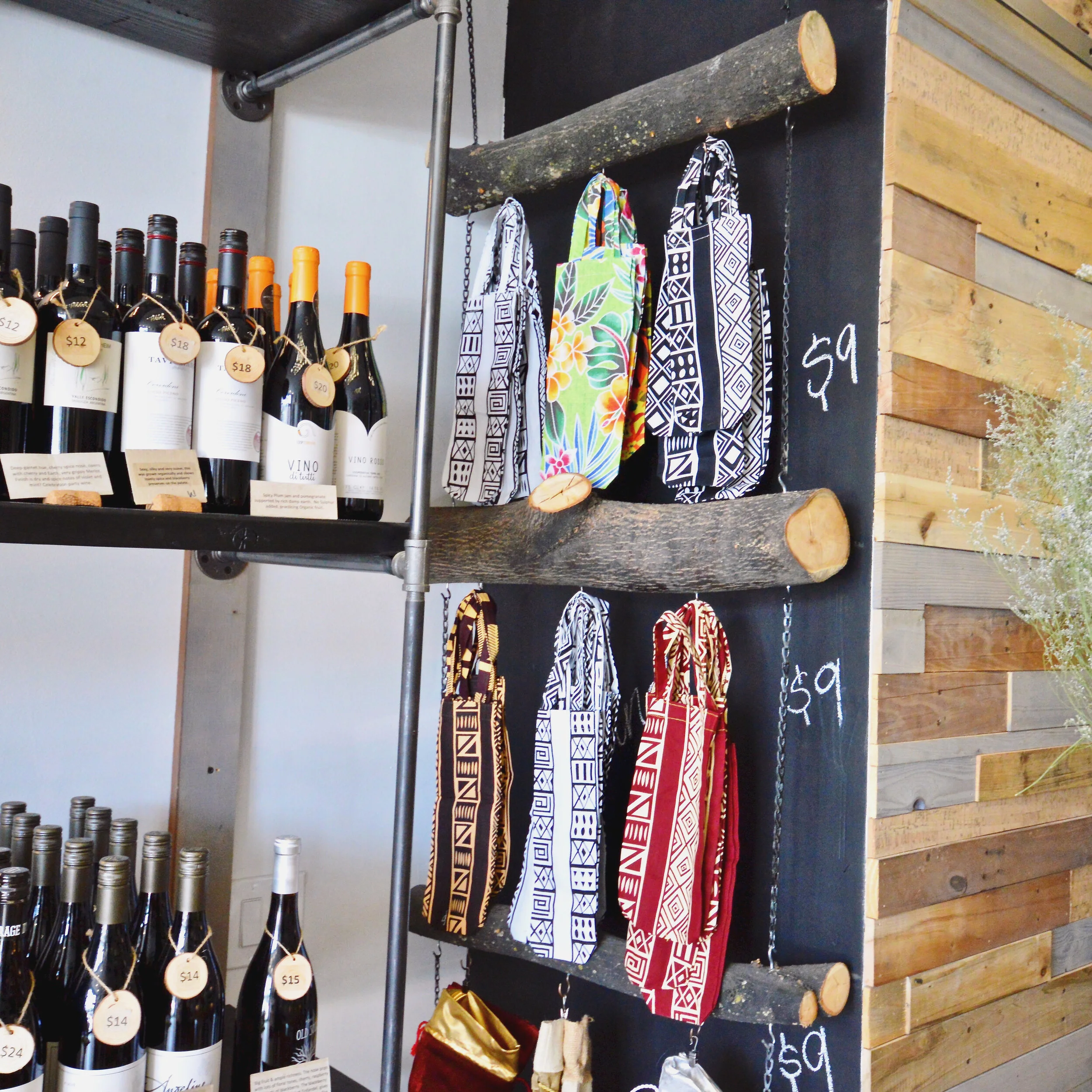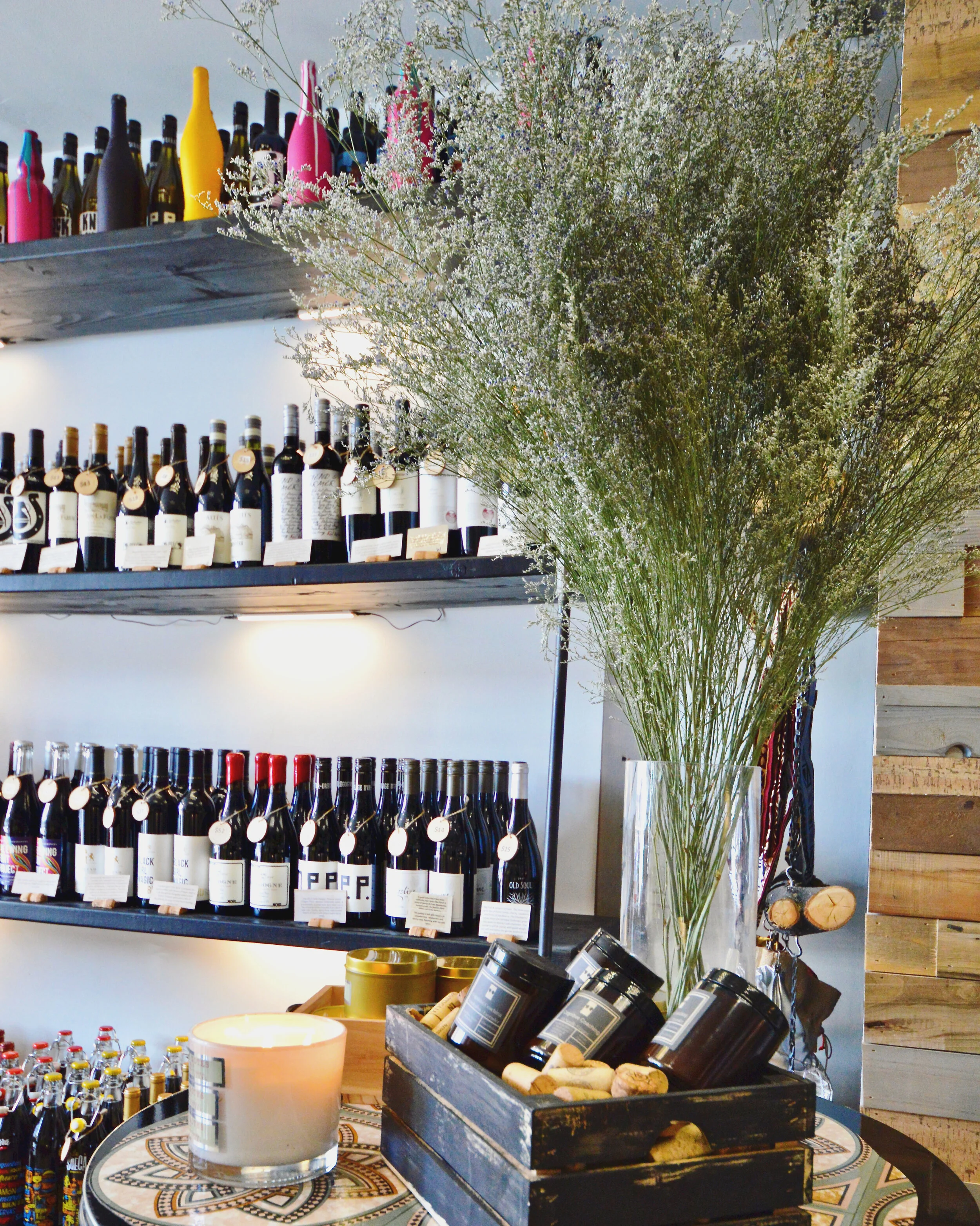 Putting her professional background in fashion design and home textiles to excellent use, she created every decor detail herself: lovely and dramatic floral arrangements, accent walls paneled with upcycled wood pallets, decorative vintage pieces, a hanging display rack made from tree stumps. In addition to the expertly curated selection of wines and spirits, Happy Cork also features a small marketplace of specialty items from local makers of color and women artists (see previous post for details). “The neighborhood needed something like this,” Sunshine says.
