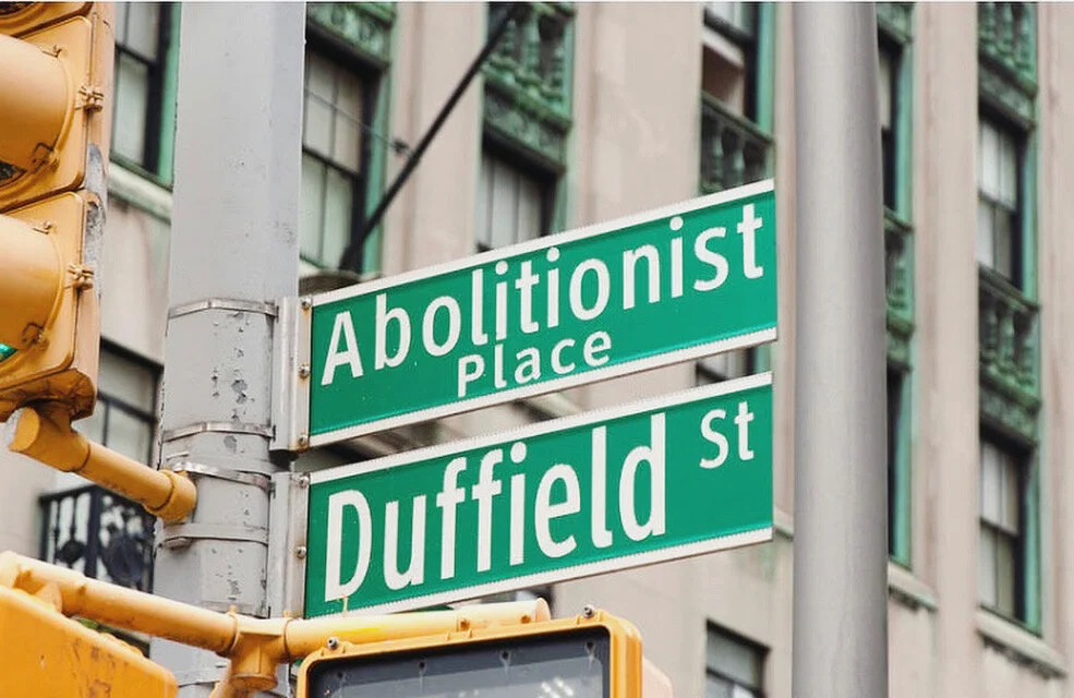 Duffield Street between Fulton and Willoughby was named “Abolitionist Place” in 2007, in honor of anti-slavery activists who organized in the area in the 1800s. While few original structures from the period remain in Downtown Brooklyn, a redbrick house at 227 Duffield, once the home of abolitionists Thomas and Harriet Truesdell, is still there (but, unfortunately, at risk of demolition). Historians believe the house was a stop on the Underground Railroad, along with other homes that stood along the same block