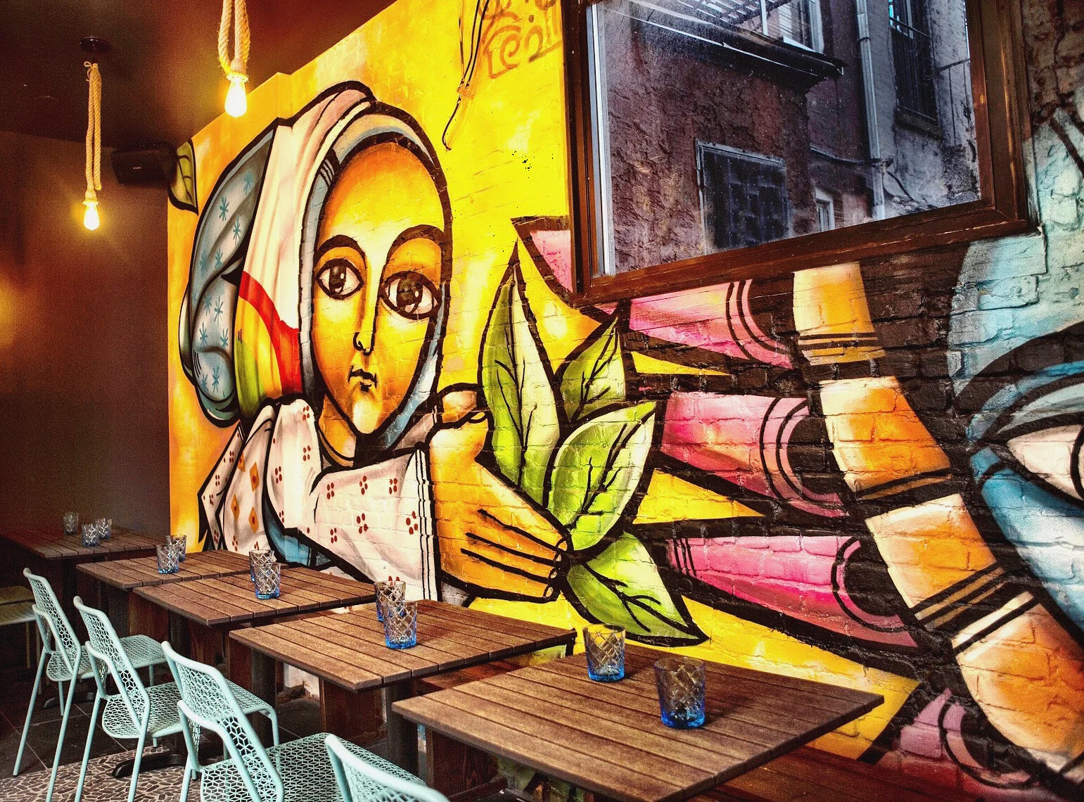 “The vibe is meant to feel like you’re in an outdoor space,” Milka says of Ras Plant Based’s striking interior design, which features graffiti-style murals by Miami-based artist Ras Terms, a thatched roof “hut” and a sleek wooden bar with exposed red brick. More specifically, the co-owners want you to feel transported to Addis in the airy 65-seat space, as if you’re at their home.